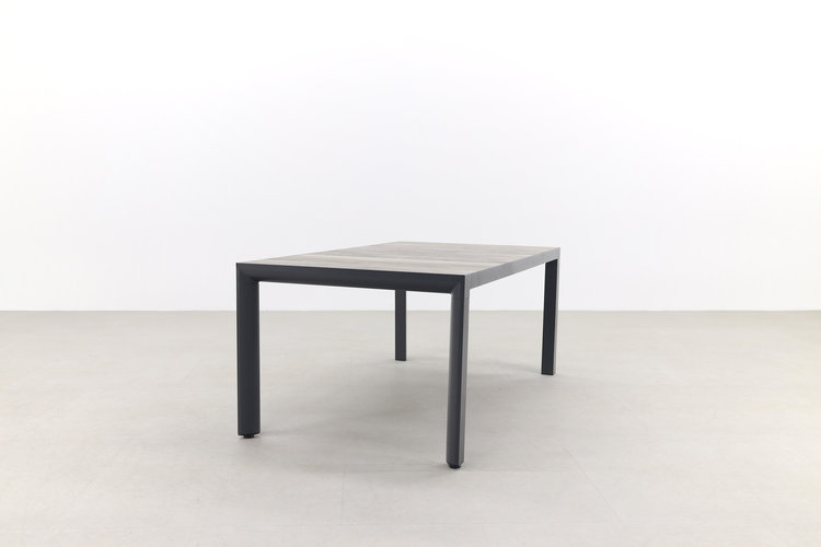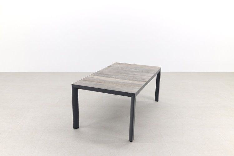 Der Kings-Tisch hat ein Aluminiumgestell mit Keramikeinlagen. Diese Inlays werden fixiert. Die Holzoptik der Intarsien verleiht dem Tisch ein luxuriöses Aussehen.