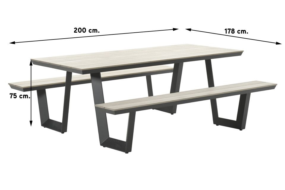 Der Bell-Picknicktisch hat ein pulverbeschichtetes Aluminiumgestell und eine Polyword-Tischplatte. Polywood (Kunststoff) hat eine Holzoptik und ist kratzfest.