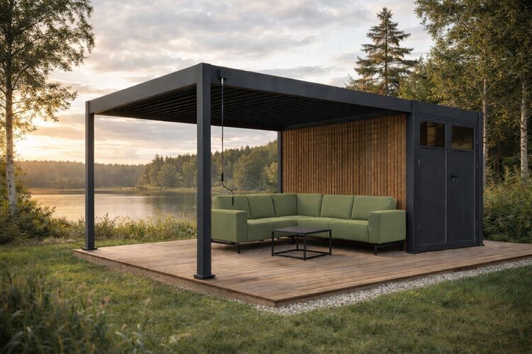 Die perfekte Terrassenüberdachung inklusive Geräteraum für die Terrasse bei Ihrer Unterkunft. Sie bietet nicht nur eine ideale Lösung für Schatten, sondern verleiht der Ferienwohnung auch ein hochwertiges, modernes Erscheinungsbild. Zudem entsteht ein praktischer Raum, in dem Ihre Gäste beispielsweise ihre Fahrräder sicher und ordentlich abstellen können.Das Dach der Premium-Überdachung ist verstellbar und kann bis zu 135 Grad geöffnet werden. Darüber hinaus ist das Dach zu 100 % wasserdicht. Das Regenwasser wird über ein integriertes Entwässerungssystem durch die Pfosten abgeleitet.