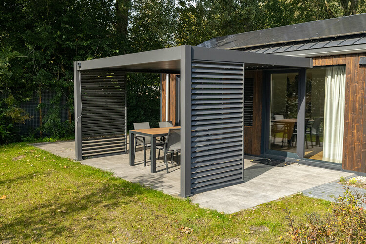 The Advance wall-mounted patio cover is the perfect way to instantly add comfort and luxury to your accommodation. Thanks to the aluminium louvre roof, which can open up to 135 degrees, guests can decide for themselves how much sunlight and ventilation they want. When closed, the lamellas make the cover fully waterproof. The durable construction and integrated water drainage through the posts ensure a long-lasting, low-maintenance solution.