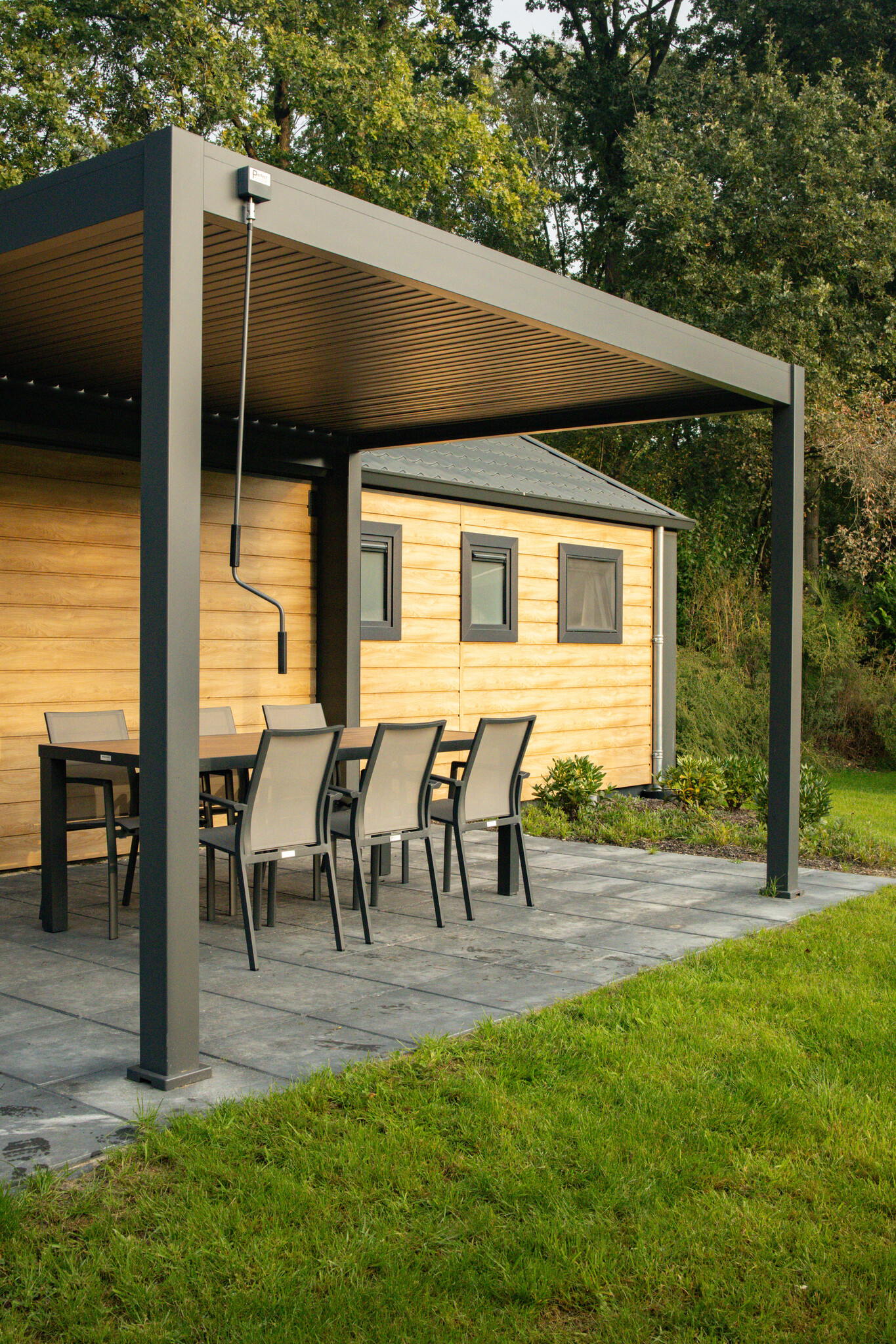 The perfect patio cover for the terrace at the accommodations. It is not only an ideal shading solution, but also gives the appearance of the holiday home a beautiful upgrade. The roof of the Premium canopy is adjustable and can open up to 135 degrees. The roof is also 100% waterproof. The water runs down through the legs via an integrated water drain.
