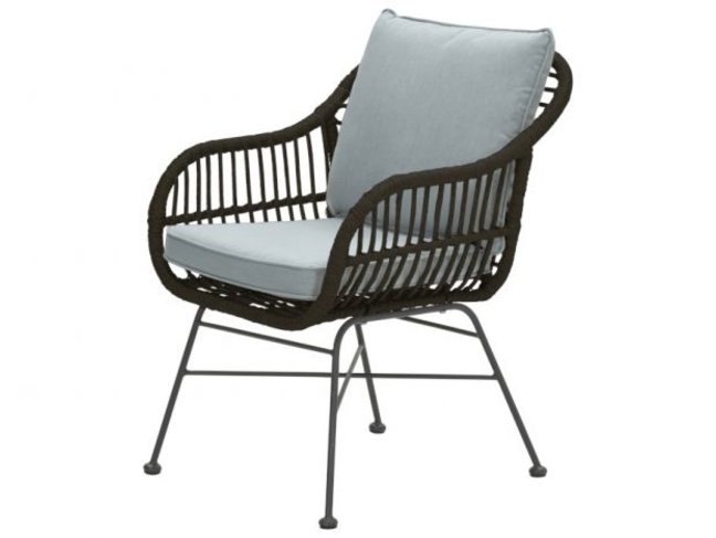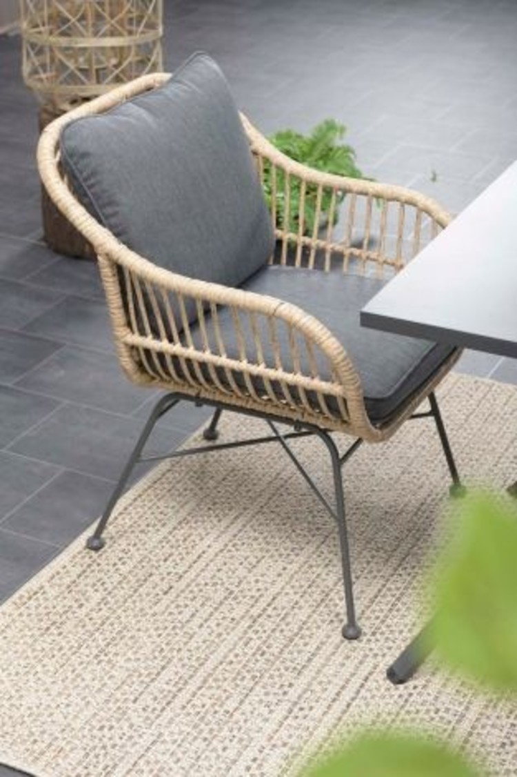 The Margriet patio chair has a seat made of aluminum. The black plastic wickerwork wire is woven around this aluminum. The legs of the garden chair are made of steel. This provides weight and strength. The steel is protected with a special coating, making it scratch and impact resistant.