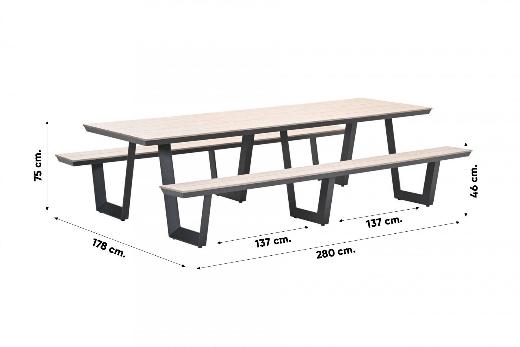 La table de pique-nique Bell est dotée d'un cadre en aluminium thermolaqué et d'un plateau en polymots. Le polywood (plastique) a un aspect bois et est résistant aux rayures.